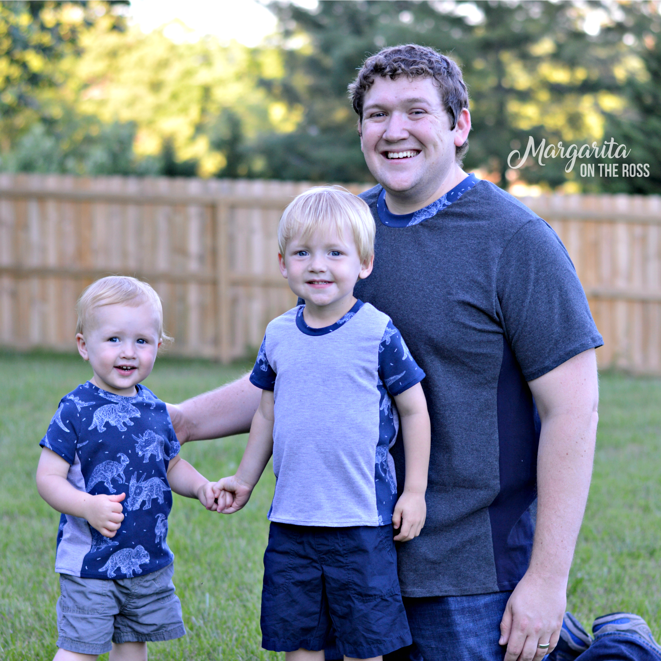 I tried to convince Jon to let me use the dinosaur fabric from Love Adore for his side panels, but he looked at me like I had lost my mind.  Which is a look I get fairly often.  So I convinced him to let me use it for the neckband in order to coordinate with the boys.  Something tells me I will be taking it off and attaching a solid band, but I will deal with that when the request comes.