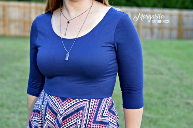 I chose to sew up a tunic with the lower front neckline and 3/4 sleeves. I wanted to be able to wear this during multiple seasons. The bodice fabric is solid double brushed poly from Pretty Posh Prints. The skirt portion is also brushed poly, and it is from Love Adore.