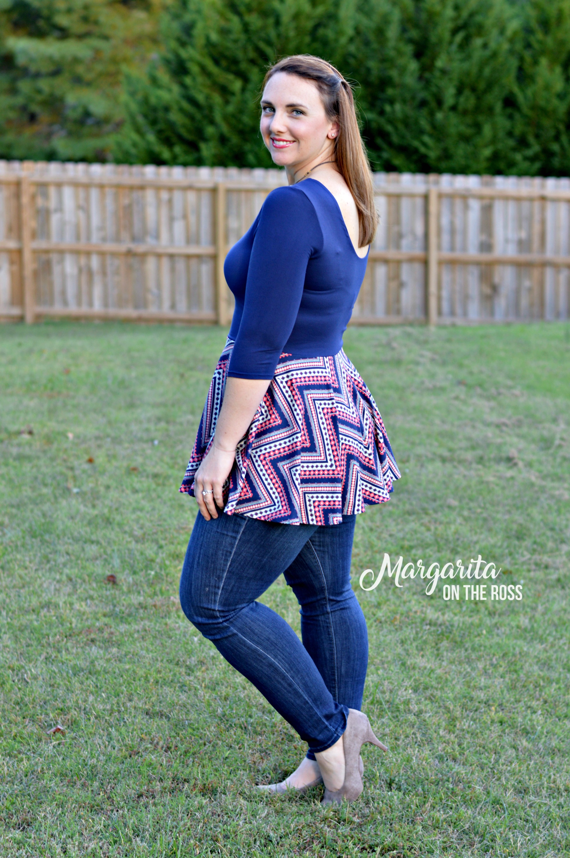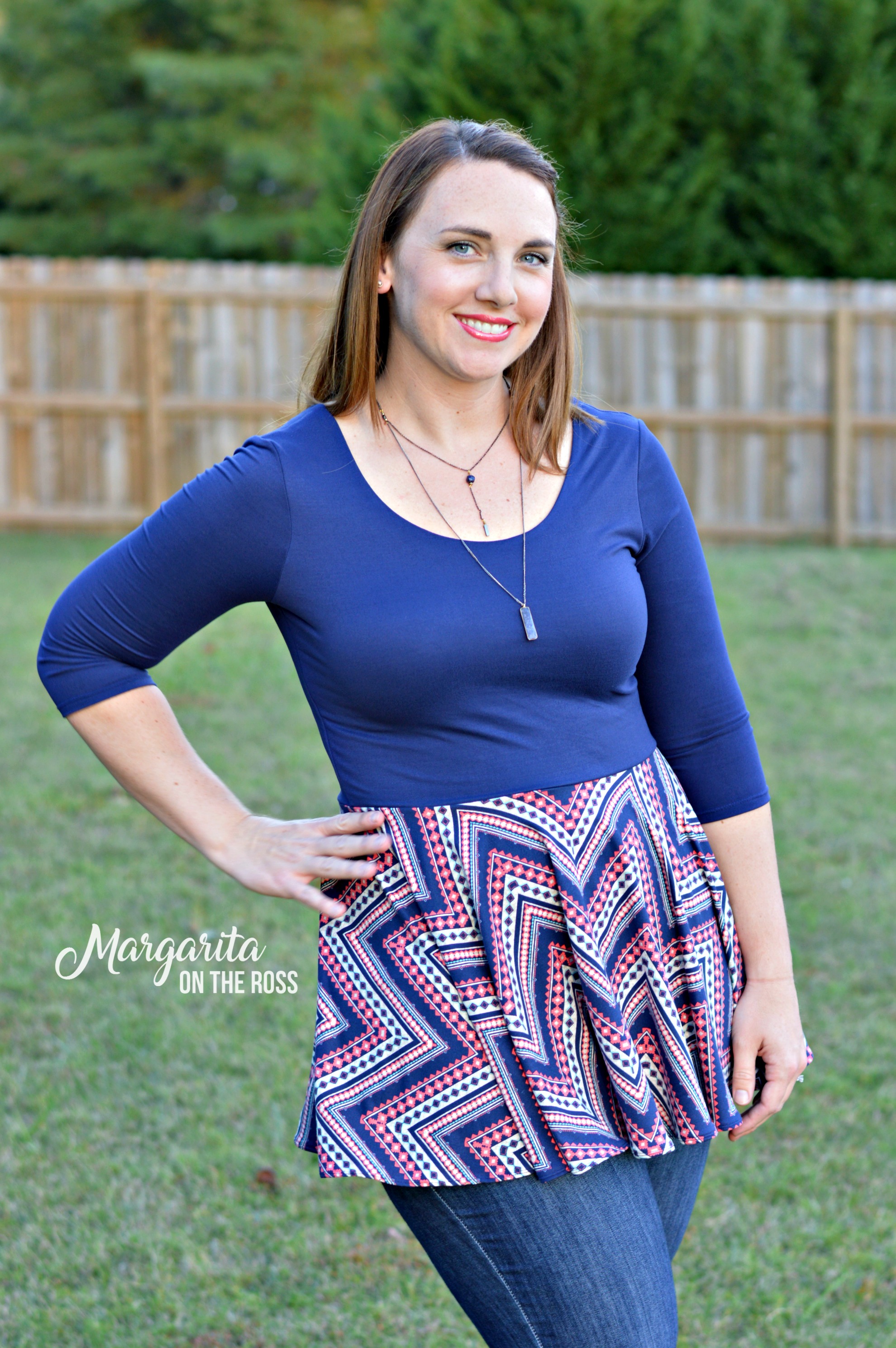 I chose to sew up a tunic with the lower front neckline and 3/4 sleeves. I wanted to be able to wear this during multiple seasons. The bodice fabric is solid double brushed poly from Pretty Posh Prints. The skirt portion is also brushed poly, and it is from Love Adore.