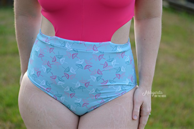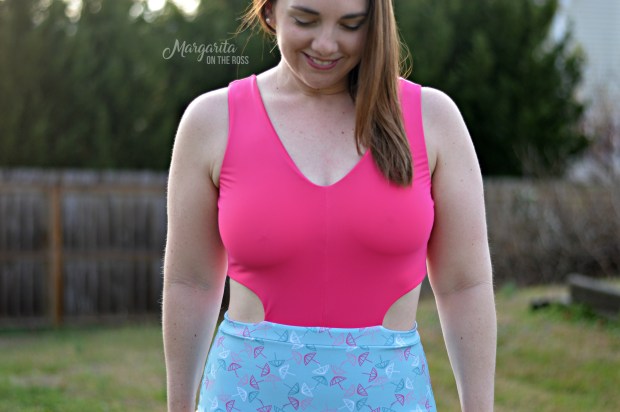 For my pink and umbrella suit, I added swim elastic to both the neckline and the armscye to my sized down bodice. I normally use size green for M4M bodices; therefore, I used size indigo and cut along the sleeveless cutline for a more form fitted look. The bodice of Sierra works as a one piece since the original pattern was designed with a romper version, meaning the bodice was designed to be able to pull up and over the booty to get the romper on.