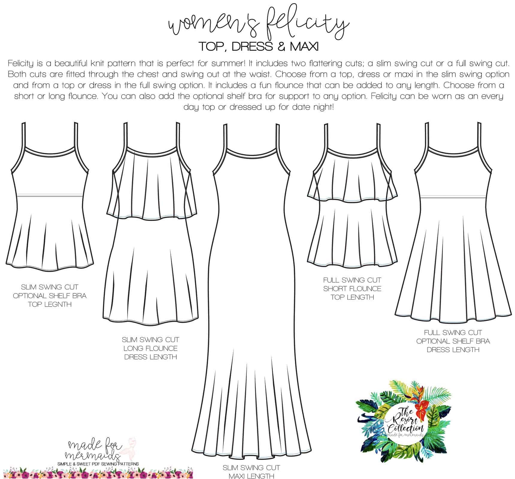The pattern has top, dress and maxi length options along with two lengths of flounces (or even no flounce). It also includes an optional shelf bra!!
