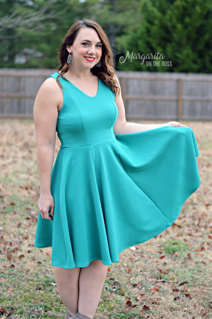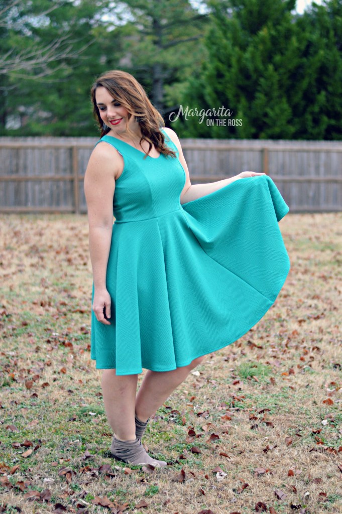 I made two versions during testing. The first dress is a tank version with both the high neckline and high back. The fabric is a chevron textured double knit that I purchased a few years ago from JoAnn.